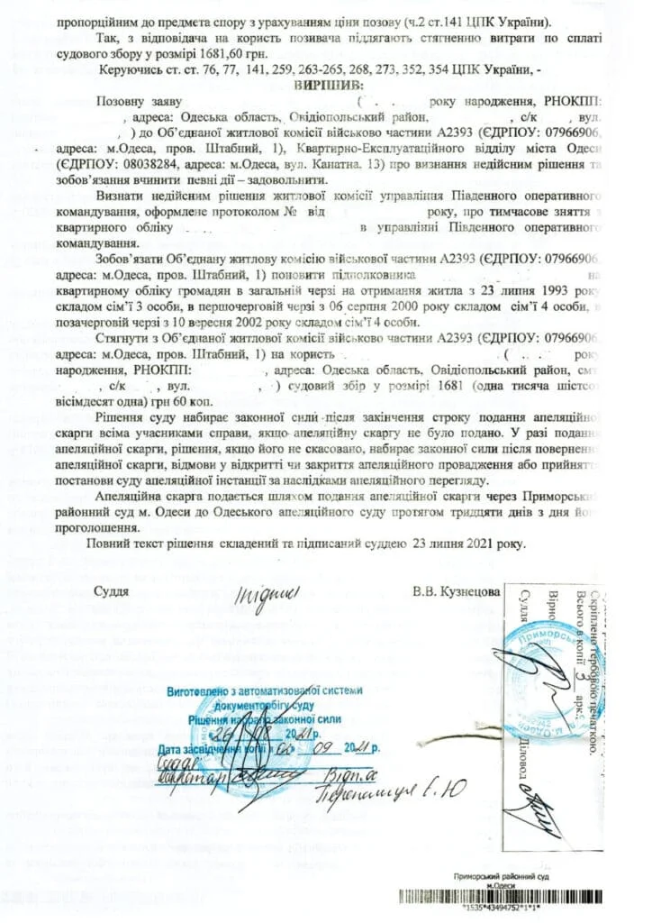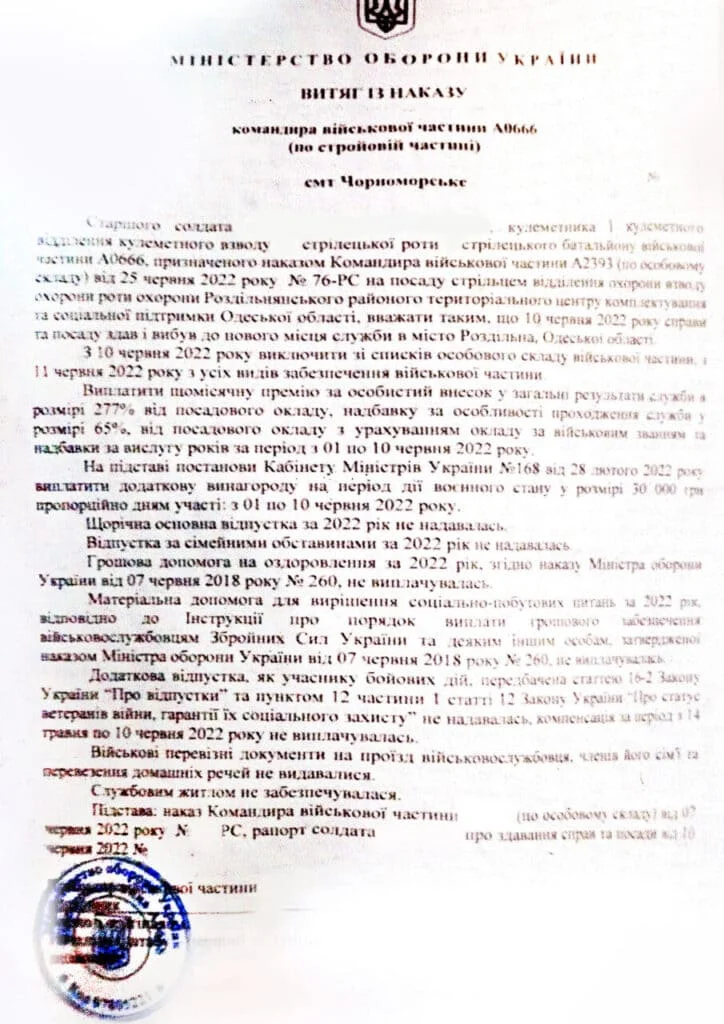 Постановка клиента на учёт в родном городе, а также оформление нового удостоверения с правильным воинским званием. Кстати, клиент служить не отказывался и сейчас защищает Украину!