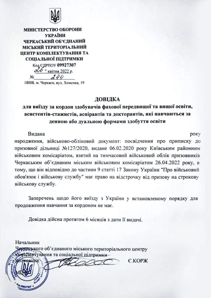 Разрешение военкомата на выезд студента заграницу