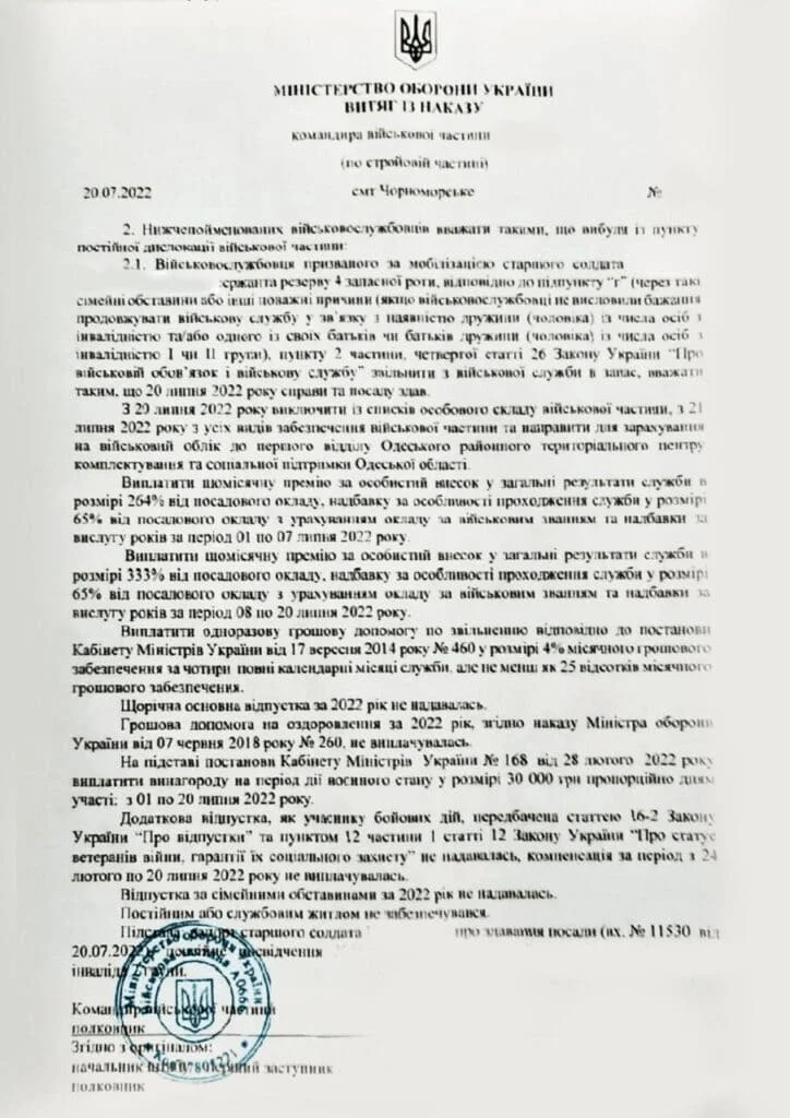 сержанта запаса призвали по мобилизации, отправили для прохождения воинской службы в Одессу. В связи с семейными обстоятельствами появилась необходимость увольнения.